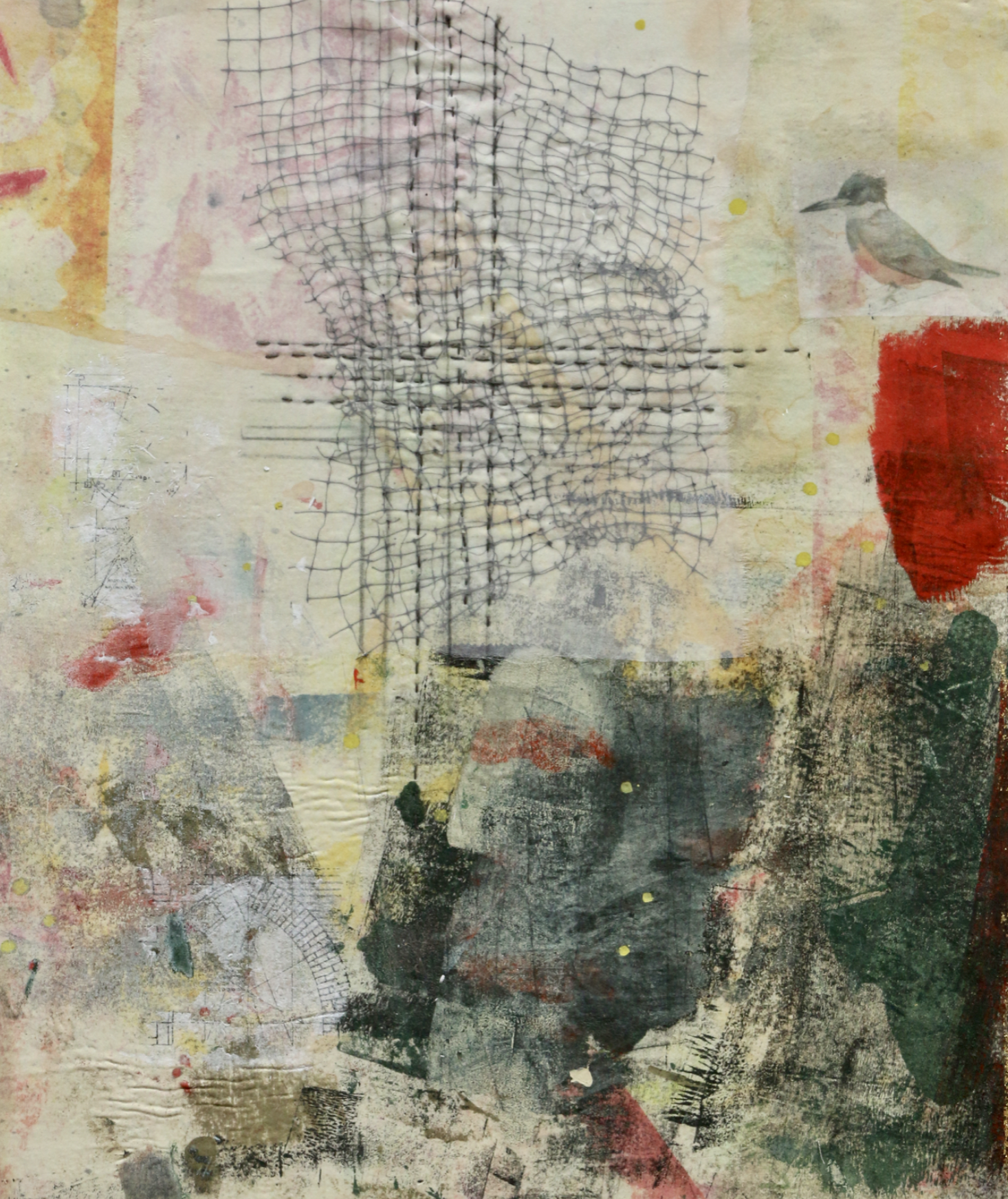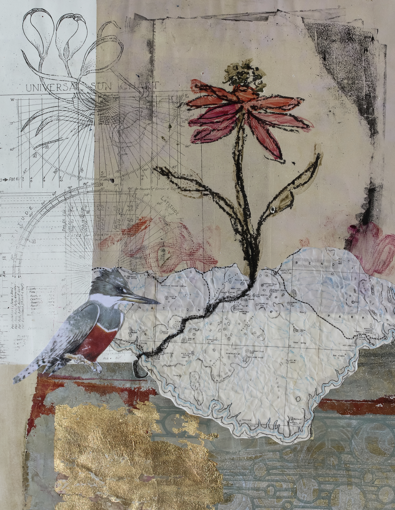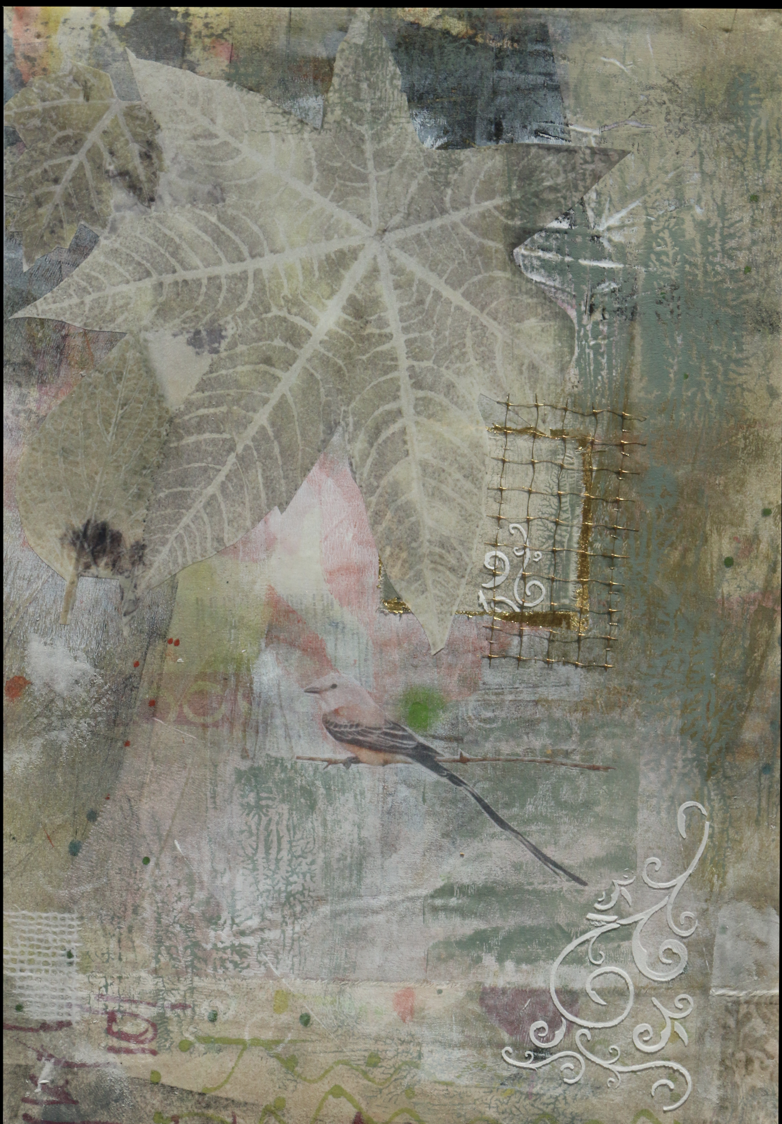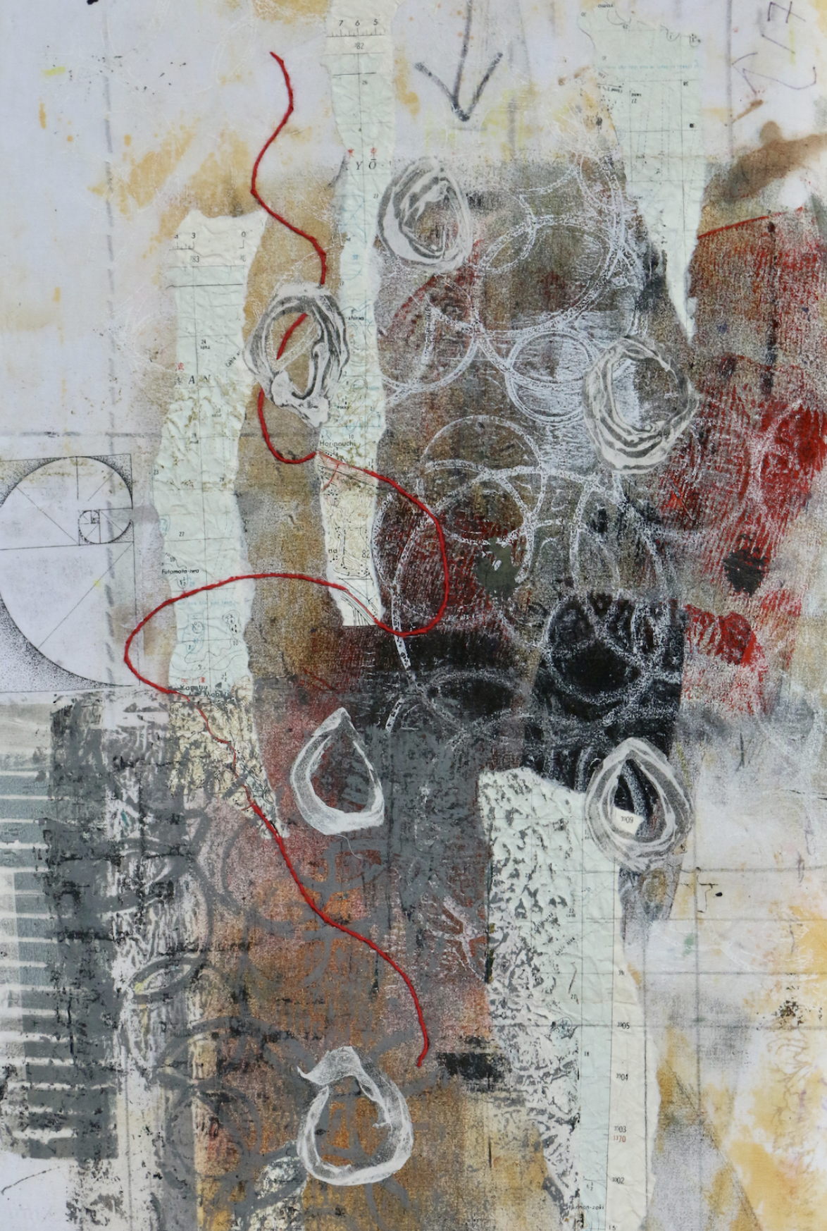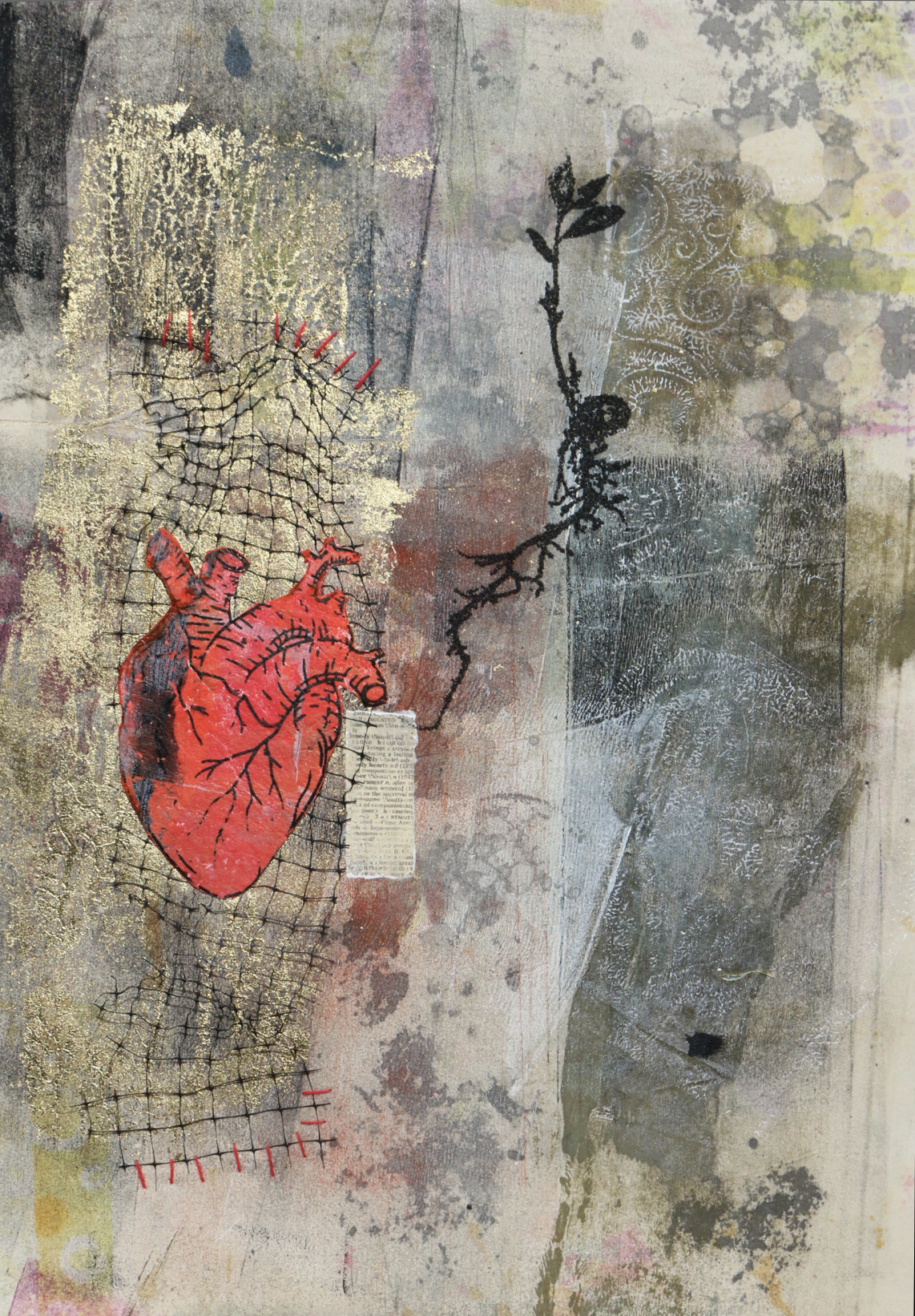 Techniques include prints from the gel plate, bubble printing, gold leafing, screen printing, inkjet transfers and hand stitching.