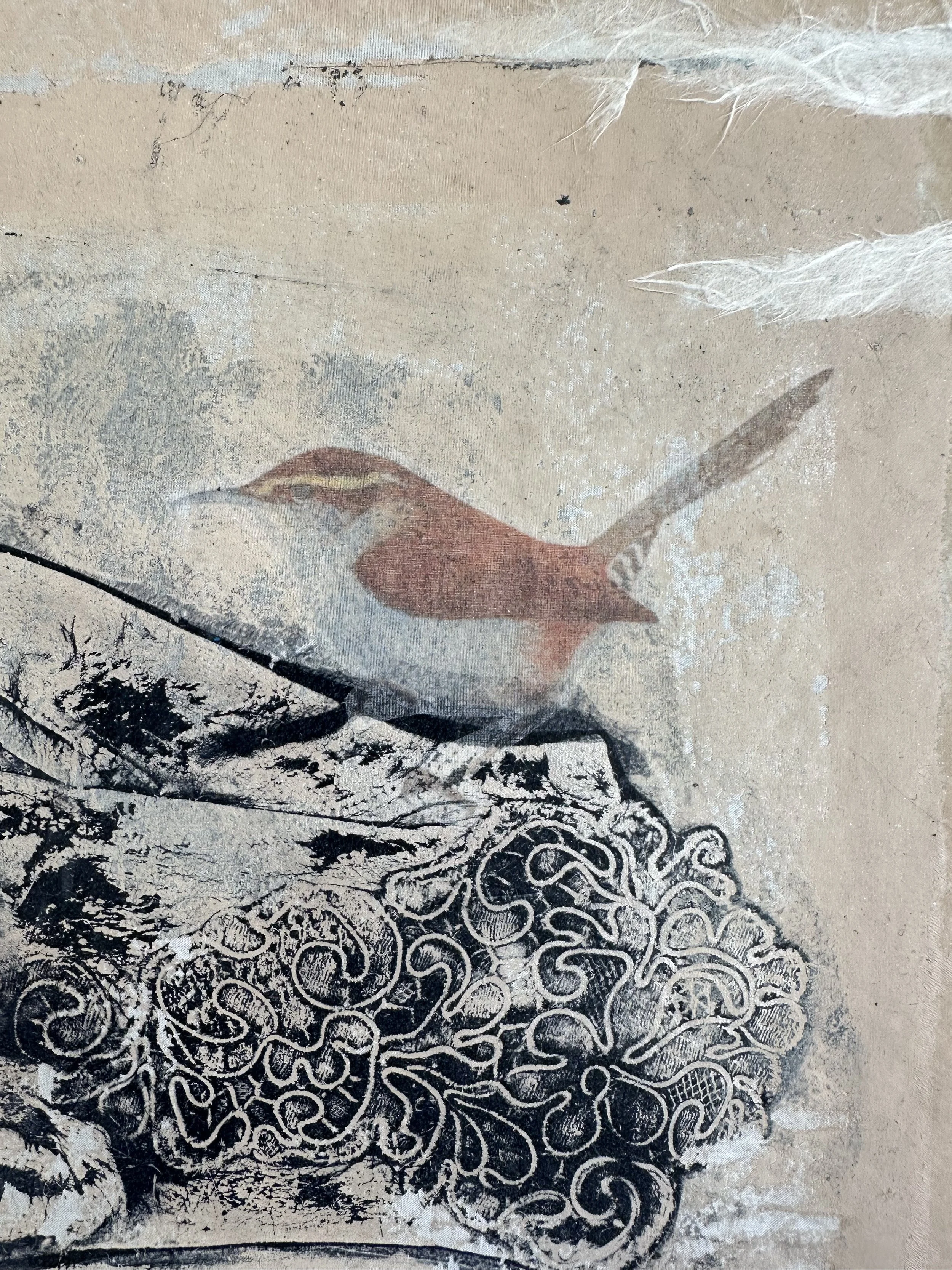 Collaging papers and other fabrics onto the background prior to printing